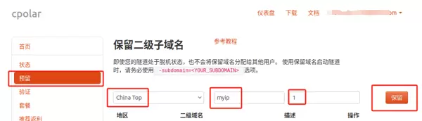 进入左侧菜单中的“预留”选项,选择“保留二级子域名”,地区建议选为 china top,随后自定义输入一个子域名名称(本例中使用 myip,用户可根据实际需求自行设定),并填写相关备注信息,确认后点击“保留”按钮。