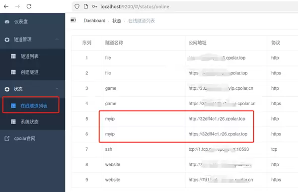 更新完成后,返回在线隧道列表页面,可以看到原先的随机公网地址已被替换为固定的二级子域名地址,名称也同步更新为所保留的子域名。