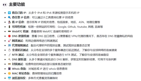 MyIP 是一个集成多种网络诊断功能的一站式工具。它不仅能查询本地公网 IP 和任意 IP 地址的归属信息(如国家、地区、ASN 等),还支持网速测试、DNS 泄露检测等多种实用功能。最重要的是,该项目完全开源免费,界面简洁美观,操作体验流畅自然,仿佛在使用一款精心设计的应用程序。
