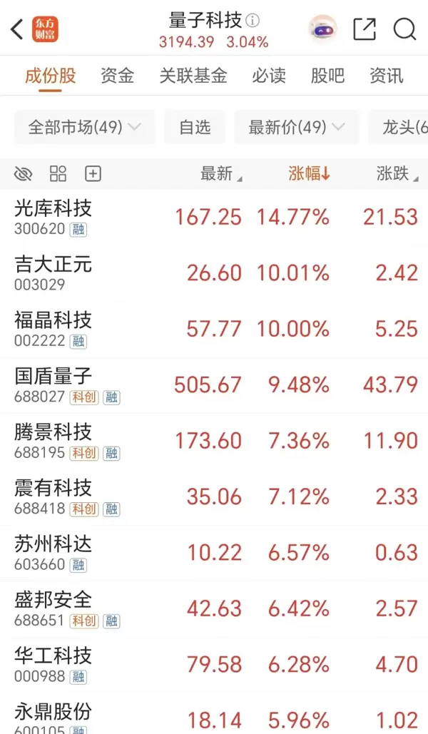 周一,量子科技概念板块表现亮眼,收盘涨幅超3%。其中,光库科技大涨近15%,吉大正元与福晶科技双双涨停,国盾量子涨幅超过9%。