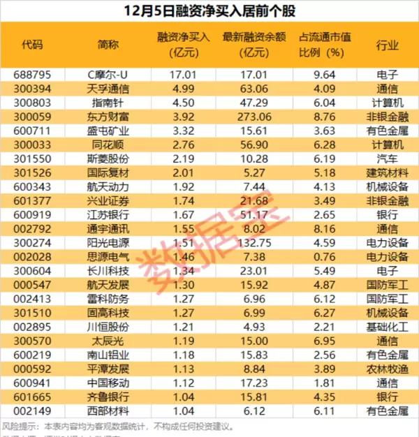 在这些个股中,C摩尔-U以17.01亿元的融资净买入额位居榜首,其融资余额占流通市值比例接近10%。紧随其后的是天孚通信,净买入4.99亿元;指南针获净买入4.50亿元。此外,东方财富、盛屯矿业、同花顺等也位列融资资金重点加仓名单之中。