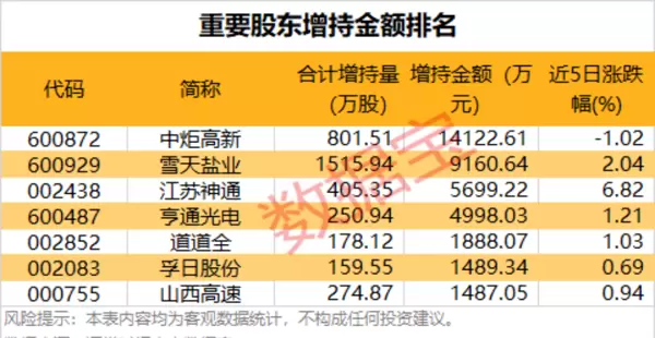 其中,增持金额超过千万元的公司有7家。增持规模最大的是中炬高新,在此期间累计增持801.51万股,总金额达1.41亿元。其次是雪天盐业,增持数量为1515.94万股,对应金额为9160.64万元。另有公司同期获股东增持5699.22万元,位列第三。