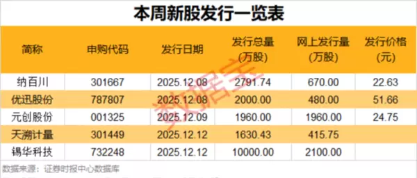 本周新股发行动态显示,共有5只新股进入申购阶段。按照所属板块划分,涵盖科创板1只、创业板2只、沪市主板1只以及深市主板1只。具体申购时间安排如下:周一(12月8日)可申购纳百川与优迅股份;周二迎来元创股份的申购机会;周五则有天溯计量和锡华科技开放申购。