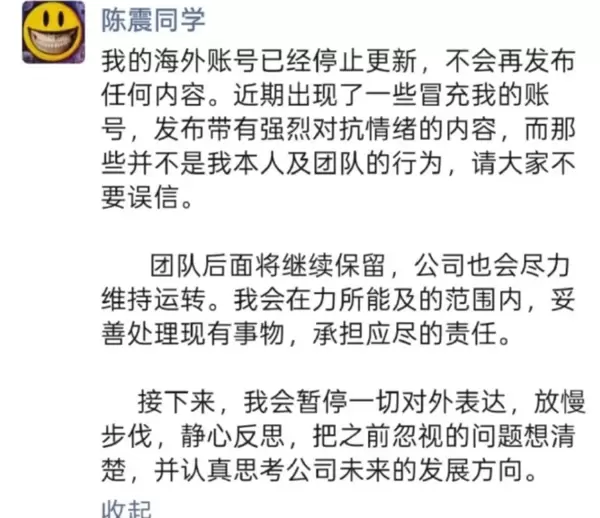 12月7日,陈震在朋友圈发文回应称,其海外账号将停止更新,不再发布任何新内容。团队将继续保留,公司也会尽力维持正常运转。他表示将在能力范围内妥善处理现有事务,履行应尽责任。同时宣布将暂停一切对外表达,放慢节奏,静心反思,厘清过去被忽视的问题,并认真思考公司未来的发展方向。