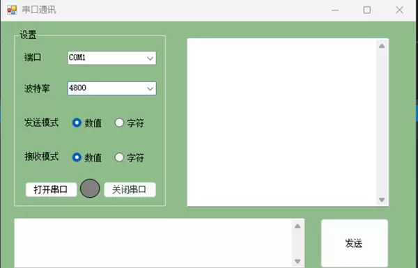 串口通信界面设计需包含基本通信参数配置项,例如COM端口选择、波特率设定、发送与接收模式选择(支持数值或字符格式)。