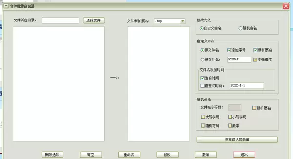 建议功能模块:目录选择、新扩展名设置、命名规则配置(序号、时间、字母)、随机命名选项(长度、字符类型)、操作按钮(重命名、修改、撤销、退出)等。