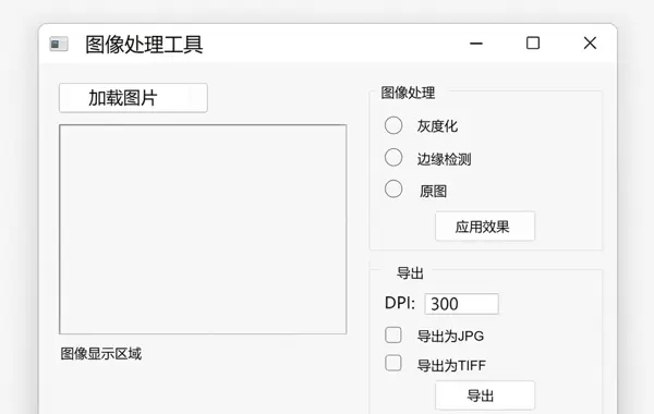 参考示例:该图像处理工具应包括图片加载模块、图像操作功能(如灰度转换、边缘检测等)、图像展示区域以及导出配置选项(支持设置DPI、输出格式为JPG或TIFF等)。