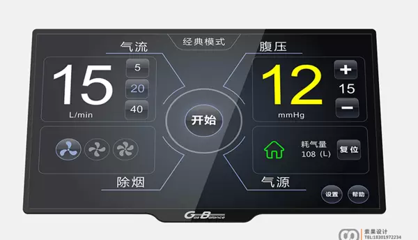 参考示例:界面包括经典模式切换、实时数据显示(如气流单位L/min、腹压单位mmHg、耗气量单位L),配备功能按钮组(开始、复位、除烟、气源控制、设置、帮助)等。
