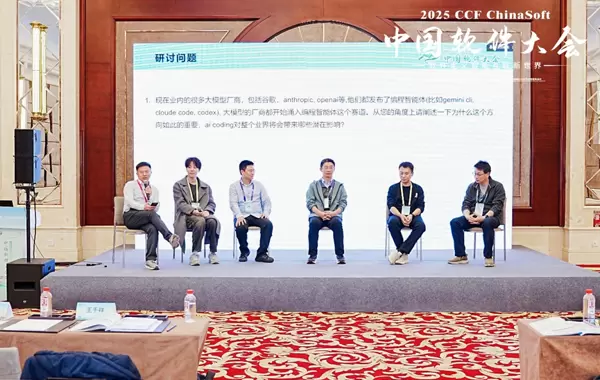 本次论坛特别设置了Panel讨论环节,由华为云数字化平台技术创新Lab主任梁广泰博士(左一)主持。参与对话的嘉宾包括中国科学院软件研究所孙泽宇副研究员(左二)、华为云数字化平台技术创新Lab边攀博士(左三)、华为云智能研发首席专家王千祥(右三)、北京航空航天大学高祥副教授(右二),以及天工开物开源基金会执行副秘书长庄表伟(右一)。围绕研发智能体的核心价值与发展影响、工业级规模化落地的关键挑战与路径、未来校企协同创新的合作模式等议题,嘉宾们展开了深入交流与思想碰撞。