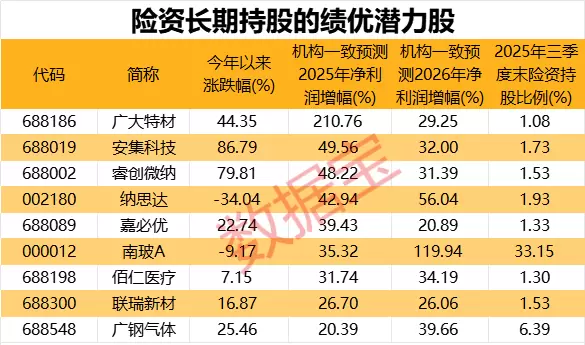 从业绩预期维度观察,在上述46只长期持有的个股中,机构一致预测2025年与2026年净利润增速均有望连续超过20%的共有9只。其中7只为科创板企业,沪深300指数与中证红利低波动100指数成份股各1只,分别为南玻A与纳思达。