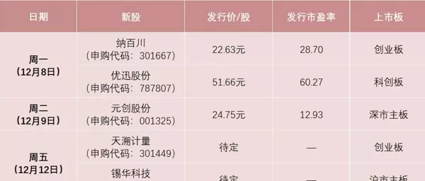本周共有5只新股进入申购阶段,涵盖主板、创业板和科创板多个板块。具体安排如下:12月8日(周一)可申购创业板的纳百川与科创板的优迅股份;12月9日(周二)开放深市主板新股元创股份的申购;而12月12日(周五),则将迎来创业板天溯计量以及沪市主板锡华科技的申购机会。
