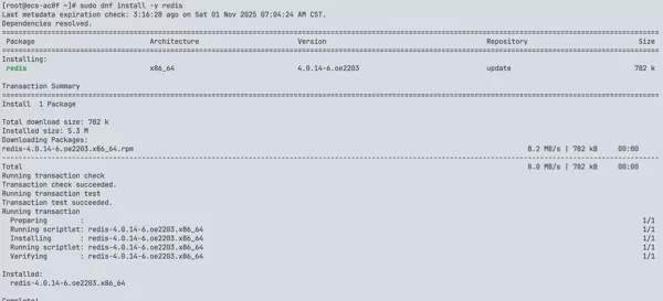 openEuler 软件源提供的 Redis 版本为 4.0.14,满足本次测试需求。安装过程快速,仅下载约 800KB 数据即可完成。