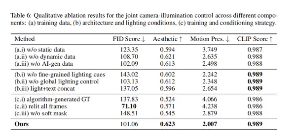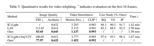 (c.ii) 若对所有帧都进行重打光处理作为输入,虽然FID分数略有提升(达到71.10),但这主要是因为输入更接近逐帧IC-Light的标准参考。然而,这种做法会大幅增加计算开销,并破坏帧间的连续性。因此,这也从反面印证了仅对单帧进行重打光的设计在效率与效果上的平衡优势。
