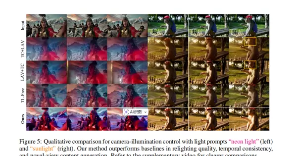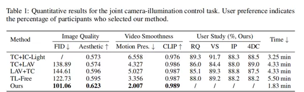 由于缺乏直接竞品,研究人员将现有相机轨迹控制方法 TrajectoryCrafter 与主流重打光技术(IC-Light、LAV)组合,构建基线模型进行对比。