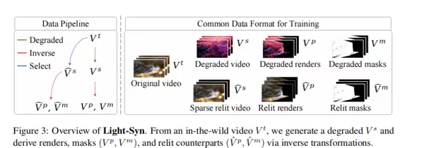 - 构建Light-Syn数据生成管线:通过逆向映射技术,从普通单视角视频中合成具有多视角与多光照特性的虚拟训练样本,缓解真实数据稀缺问题。