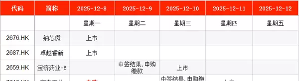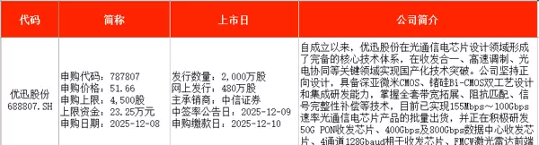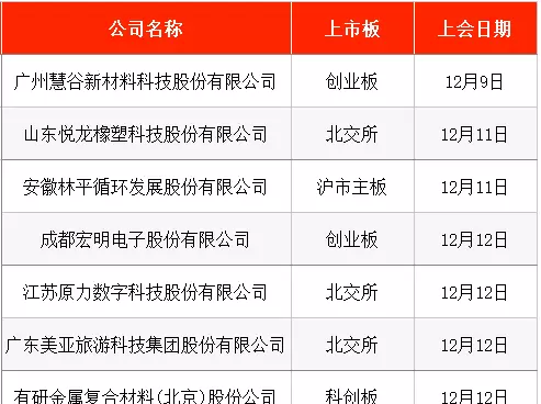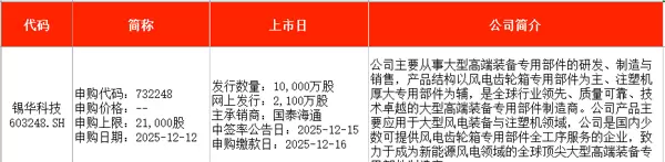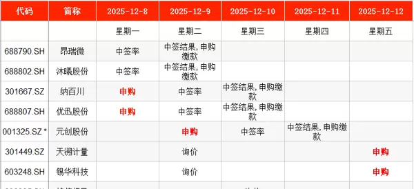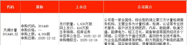 - 天溯计量(301449)和锡华科技(603248)则均安排在周五(12月12日)申购。