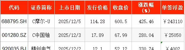其中,于12月5日在科创板挂牌的摩尔线程,上市首日股价上涨达425.46%。若按当日收盘价计算,中签投资者每签可实现浮盈约24.31万元,显示出市场对优质标的的高度认可。