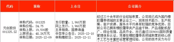 - 元创股份(001325)定于周二(12月9日)进行申购;