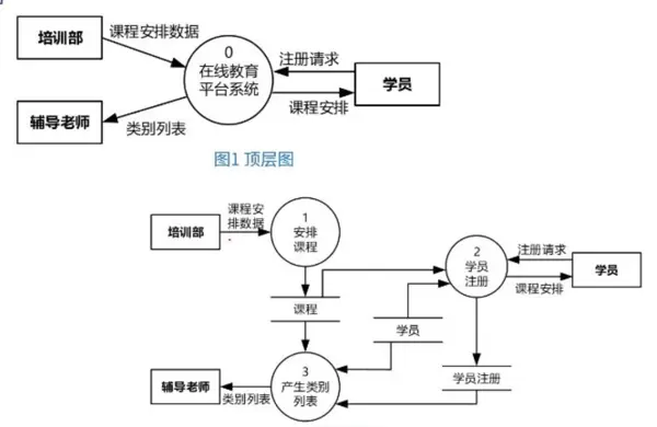 顶层图是DFD的最高抽象层级,仅包含一个代表整个系统的椭圆(如“在线教育平台系统”)及其相关的外部实体。