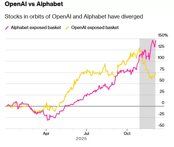 市场对人工智能领域两大巨头的态度正在经历显著转变,这种变化尤其体现在围绕“OpenAI链”与“谷歌链”的行情分化上。曾经备受追捧的OpenAI相关企业近期普遍承压,而Alphabet及其生态伙伴则展现出强劲增长势头。