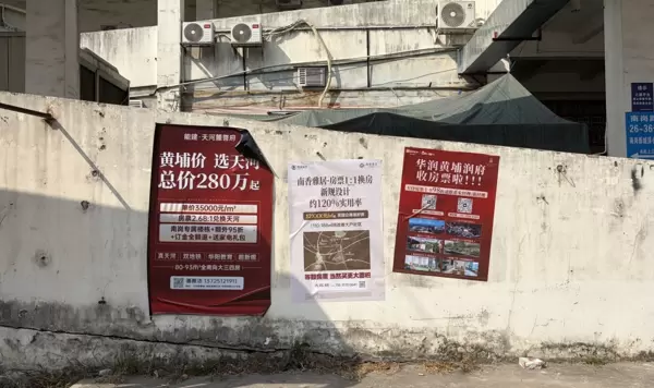 如今,南岗村各处巷道已被来自全市各地楼盘的宣传海报覆盖。村民日常买菜途经的肉菜市场对面墙上,天河与增城的项目展开无声竞争。天河项目“能建·天河麓誉府”打出“黄埔价、选天河”的口号,但其单价远高于补偿标准,房票兑换比例高达2.68:1;而增城楼盘则主打“房票1:1换房”,强调“等额票面,买更大面积”。