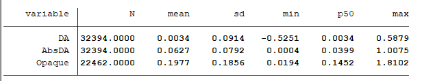 分年分行业回归,将估计出来的回归系数代入公式,可估计出操控性应计利润/应计盈余管理DA。数据已剔除金融行业、st公司、退市公司以及缺失变量的数据。其中,TA总应计利润=净利润 - 经营活动产生的现金净流量;PPE = 固定资产原值。