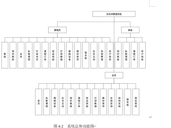 其中,小程序会员端面向广大羽毛球爱好者,用户可通过该端口浏览体育馆提供的私教课程信息、查看教练资料,并在线完成预约操作;后台管理员作为系统最高权限角色,具备对会员账号、教练信息等基础数据进行全面维护与管理的能力;教练端则主要用于管理个人课程安排、查看课程订单状态,并对会员提交的预约请求进行审核处理。