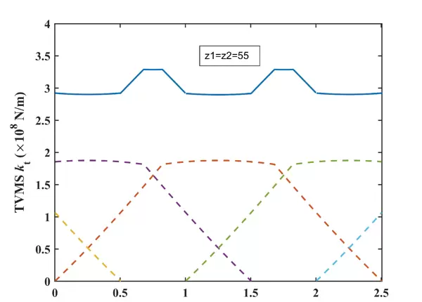 其中的θ并非普通旋转角度,而是融合了螺旋角β的余弦分量,在时域中呈现出类似探戈般的动态节奏。变位系数xn在此处不再是静态参数,而是通过正弦函数参与动态调制。特别值得注意的是(z1+z2)θtanβ/(2π)这一项,它使得接触线如同拉链般沿齿面连续滑移。相比之下,传统方法常采用平均接触线长度进行近似,导致所获得的刚度曲线过于平缓,无法捕捉真实的动态特征。