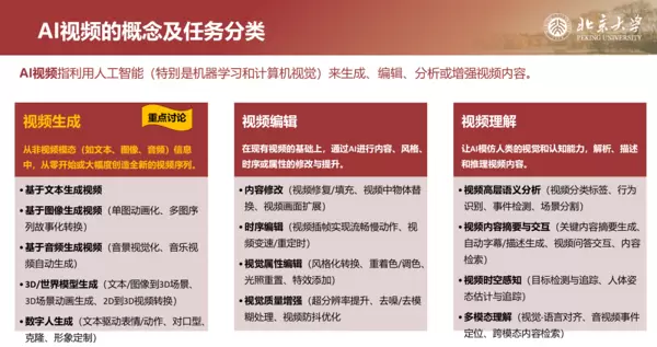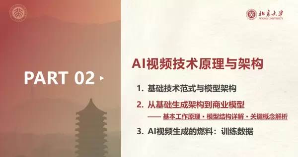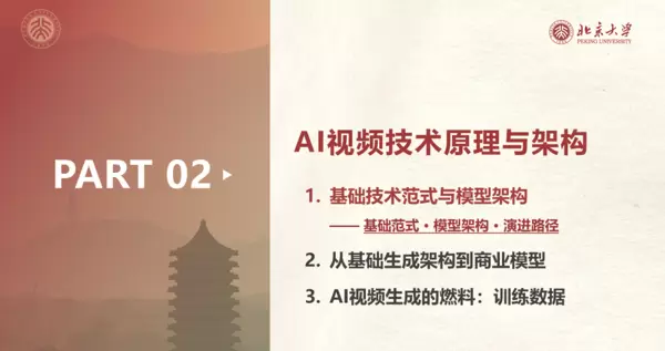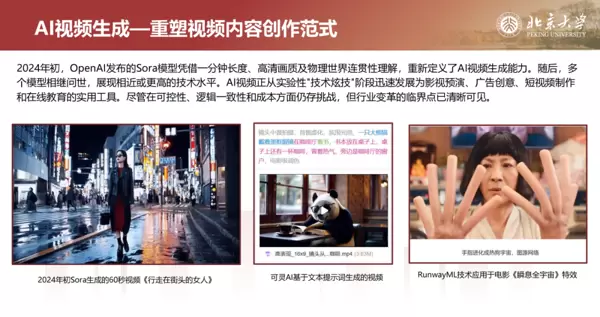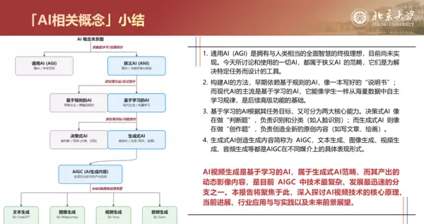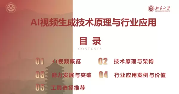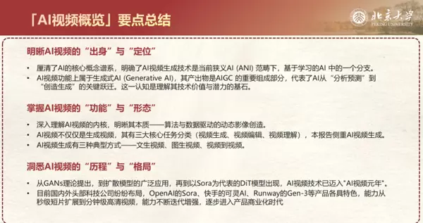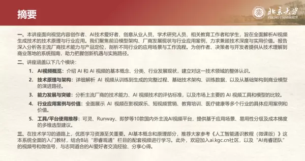本报告由北京大学 AI 肖睿团队撰写,聚焦于 AI 视频生成技术的原理解析与行业应用探索,系统梳理了技术架构、能力演进、应用场景及工具选型策略。整体内容可归纳为五大核心模块:
