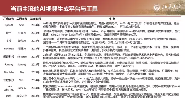 国内外代表性工具不断涌现,形成差异化竞争格局。国际平台如 Runway、Pika 在创意自由度上占优;国内则有快手可灵 AI、字节即梦 AI、海螺 AI、Pixverse、Vidu 等,分别在中文适配、风格化生成和特定领域应用中具备优势。