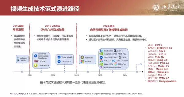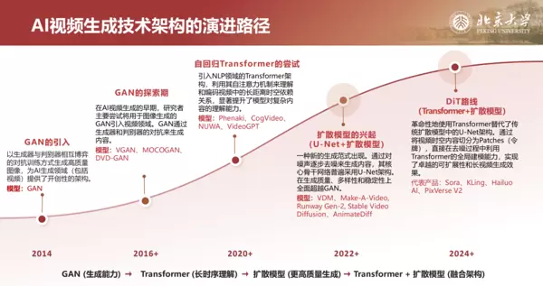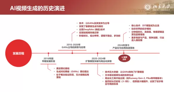 从发展历程来看,AI 视频技术经历了三个关键阶段:2016 年前以 GANs 为主的初步探索期;2020 至 2024 年间,扩散模型推动商业化落地;2024 年随着 OpenAI 发布 Sora,标志着“AI 视频元年”的开启,行业迈入分钟级高清视频批量生成的新阶段。