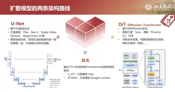 当前 AI 视频生成以扩散模型为主流技术范式,得益于其训练稳定性与生成多样性优势。该类模型主要分为两类架构:一类基于 U-Net 结构(如 Pika、Gen-2),具备较低训练门槛但时序一致性较弱;另一类采用 DiT 架构(即 Transformer 与扩散模型结合,代表为 Sora、可灵 AI),虽计算成本较高,但在长视频生成中展现出更强的时间连贯性。