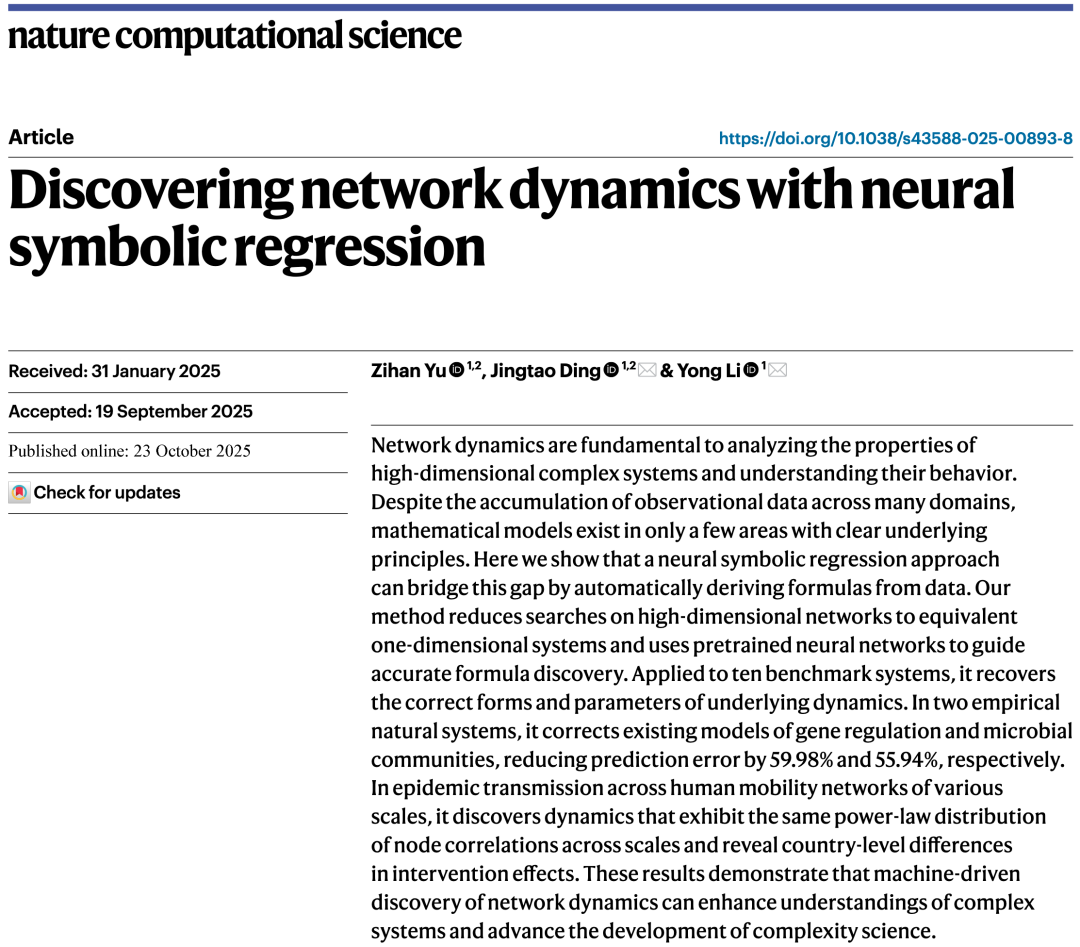 近日,清华大学电子工程系李勇教授团队提出一种神经符号回归的方法,能够从数据中自动推导公式。该方法减少了在高维网络中的搜索,使其等价为一维系统,并且使用预训练的神经网络来指导正确的公式发现。在十个基准系统中,他准确恢复了底层动力学的形式和参数。在两个基于实证数据的自然系统中(基因调控和微生物群落),它修正了现有模型。预测误差分别降低了 59.98% 和 55.94%。对于不同尺度下人类流动网络的流行病传播中,该方法发现了跨尺度的节点相关性呈现相同的幂律分布,并且揭示了国家间干预效果的差异。这一成果展现了机器驱动的网络动力学发现如何理解并推动复杂系统科学的发展。