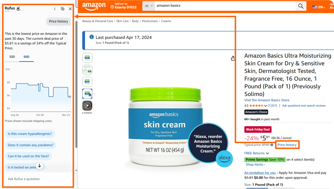 近期,部分商品价格旁新增“Price History”(价格历史)功能,彻底打破价格信息差。消费者只需点击对应链接,页面左侧就会展开Rufus AI生成的价格曲线,过去30天、90天的价格波动、历史低价、过往折扣力度等信息一目了然,这意味着消费者再也不用“猜优惠”, 商品的价格变化轨迹会成为下单的重要参考之一。