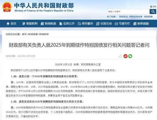 财政部计划于12月12日启动2025年到期续作特别国债的发行工作。针对此次发行的相关情况,财政部有关负责人接受了记者的采访,就关键问题作出说明。