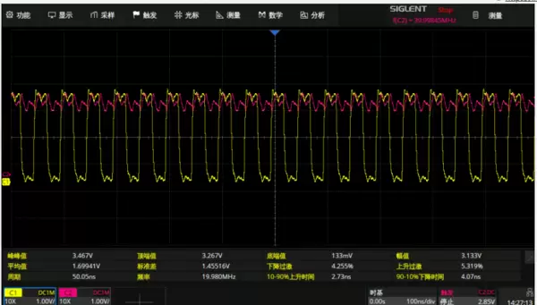 初期使用示波器采样时间较长,误判震荡频率约为20Hz,但在系统中并未找到对应低频源。随后出于排查需要,监测了一组与DONE信号走线平行但当前未使用的FPGA IO口,意外发现其存在约20MHz的周期性切换信号。