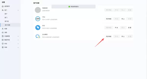 当企业微信配置正确无误后,点击“开启”按钮激活配置。此时,“同步数据”选项变为可用状态。