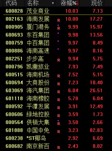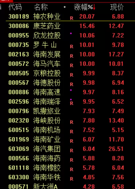 海南概念集体走强,海马汽车、海南高速等近十只相关个股涨停。