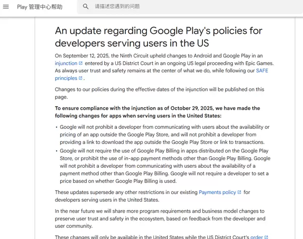 针对美国市场的外部购买链接政策已于2025年10月29日发生重要变更,Google Play已在官方页面发布相关说明。