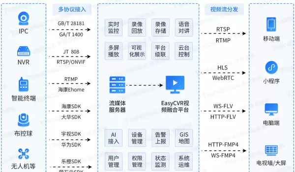 当前市场中,RTSP、Onvif、GB28181等多种通用协议与海康、大华、宇视等厂商私有SDK并存;同时,移动端、无人机、单兵设备又采用各自独立的接入方式。这导致原始数据在源头即呈现“割裂”状态,难以实现统一管理。