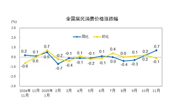 国家统计局于12月10日公布了最新的居民消费价格指数(CPI)和工业生产者出厂价格指数(PPI)数据。数据显示,随着扩内需政策逐步落地并显现成效,国内消费持续回暖,11月份CPI同比上涨0.7%,为2024年3月以来的最高水平。与此同时,受部分行业供需结构优化及国际大宗商品价格传导等影响,PPI环比微涨0.1%,同比下降2.2%。