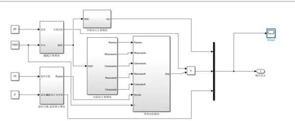 首先,电池等效电路模型的选择至关重要。目前应用较广的是二阶RC等效电路模型,因其在计算复杂度和建模精度之间取得了良好平衡。该模型可在Simulink中构建如下结构: