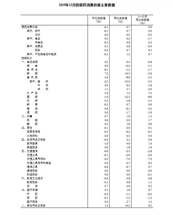 2025年11月,全国居民消费价格同比上升0.7%。分地区来看,城市居民消费价格涨幅为0.7%,农村上涨0.4%;从分类看,食品价格微涨0.2%,非食品价格上涨0.8%;消费品价格上涨0.6%,服务类价格则上涨0.7%。2025年1月至11月累计,全国居民消费价格与去年同期相比保持持平。