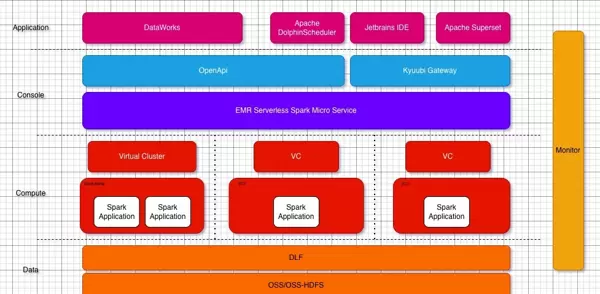 通过集成 EMR Serverless Spark 官方提供的 spark-submit 工具实现数仓任务的调度,该工具完全兼容开源版本的 spark-submit,极大简化了现有数仓架构向云原生环境的整体迁移流程。 同时,借助 EMR Serverless Spark 提供的 Kyuubi Gateway 支持日常数据分析与即席查询操作。Kyuubi Gateway 不仅提供 100% 兼容开源标准的 RESTful 和 JDBC 接口,还在云原生部署场景下显著增强了服务稳定性及作业提交的并发性能。应用层