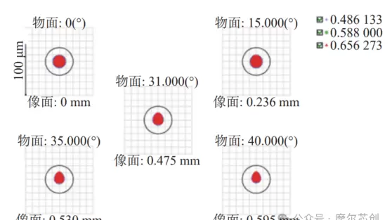 利用 Zemax 的点列图仿真功能,对不同视场下射线束的分布情况进行追踪分析。仿真结果表明,在 0° 至 40° 的全视场范围内,弥散斑始终位于艾里斑之内,球差、彗差等主要像差得到了良好抑制,成像质量稳定可靠。