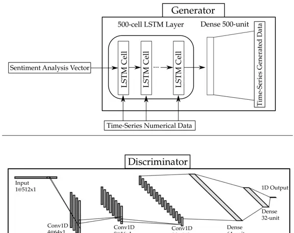- 生成器(Generator):采用LSTM结构,接收两个输入:128维的历史金融特征(如开盘价、收盘价、交易量等)与前述100维情感向量,联合编码后输出未来时刻的股价预测值。