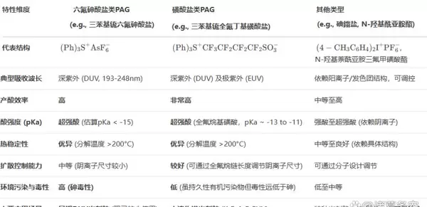 六氟砷酸盐类PAG在产酸效率和热稳定性方面表现优异,但在环境安全性和工艺兼容性上逊于新型氟代烷基磺酸酯类PAG(如4-烷基-N-羟基萘酰亚胺氟代烷基磺酸酯)。后者具备更低的金属残留风险和更好的可控扩散特性,逐渐成为先进节点的主流选择。