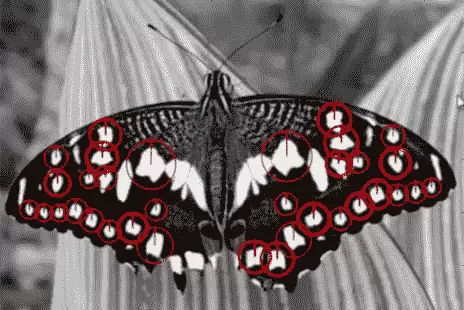 从结果可见,SURF更倾向于识别斑点类结构,例如蝴蝶翅膀上的白色区域即被成功捕捉。