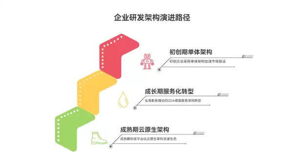 企业研发架构的演进,是伴随组织规模扩张与业务复杂度提升而发生的自然进程。这一过程本质上是从集中走向分布、从紧耦合转向松耦合,核心目标在于应对不同发展阶段下的系统可扩展性、团队协作效率以及业务迭代速度等挑战。