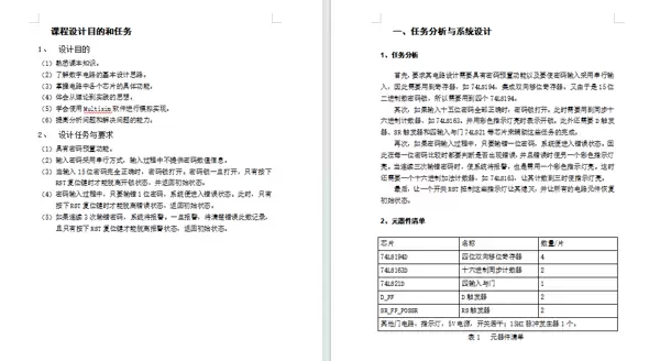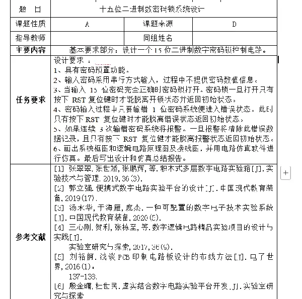 - 图纸与仿真要求:需完成系统框图、逻辑电路原理图及接线图的设计,并利用电路仿真软件进行功能验证,最终提交完整的设计说明与仿真分析报告。